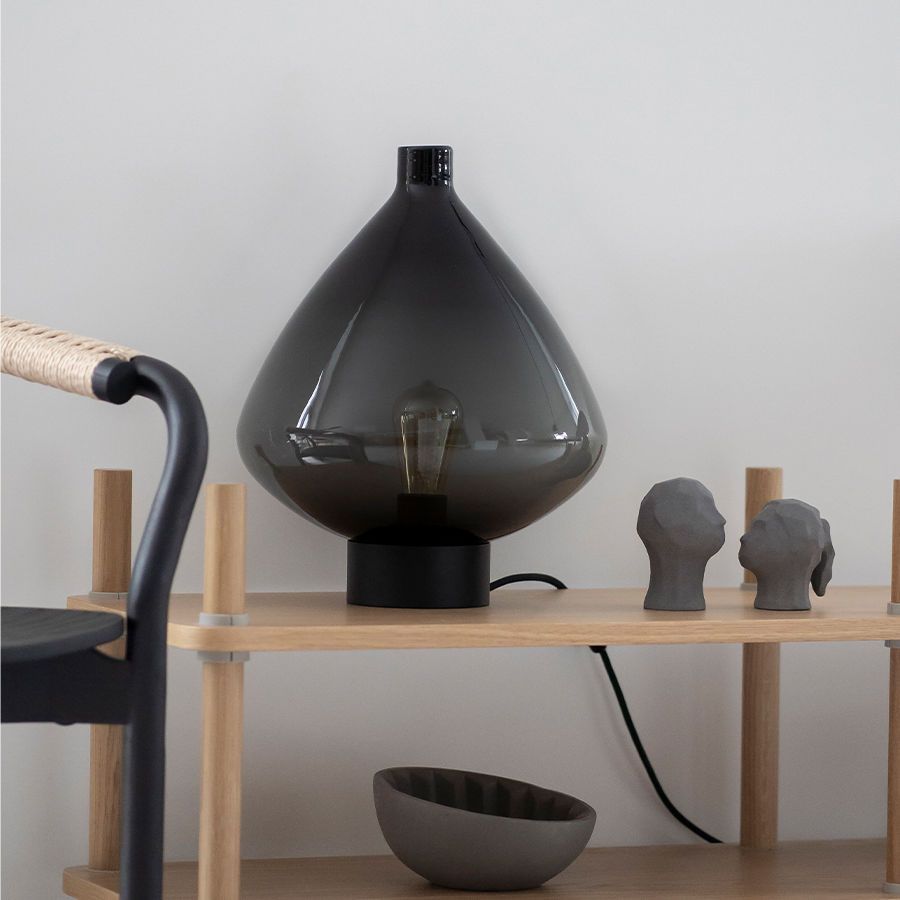 Materiale: Munnblåst glass i fargene kakao, røkgrå eller stålblå. Sort bordsokkel med 2,5 m stoffledning og dimmer.