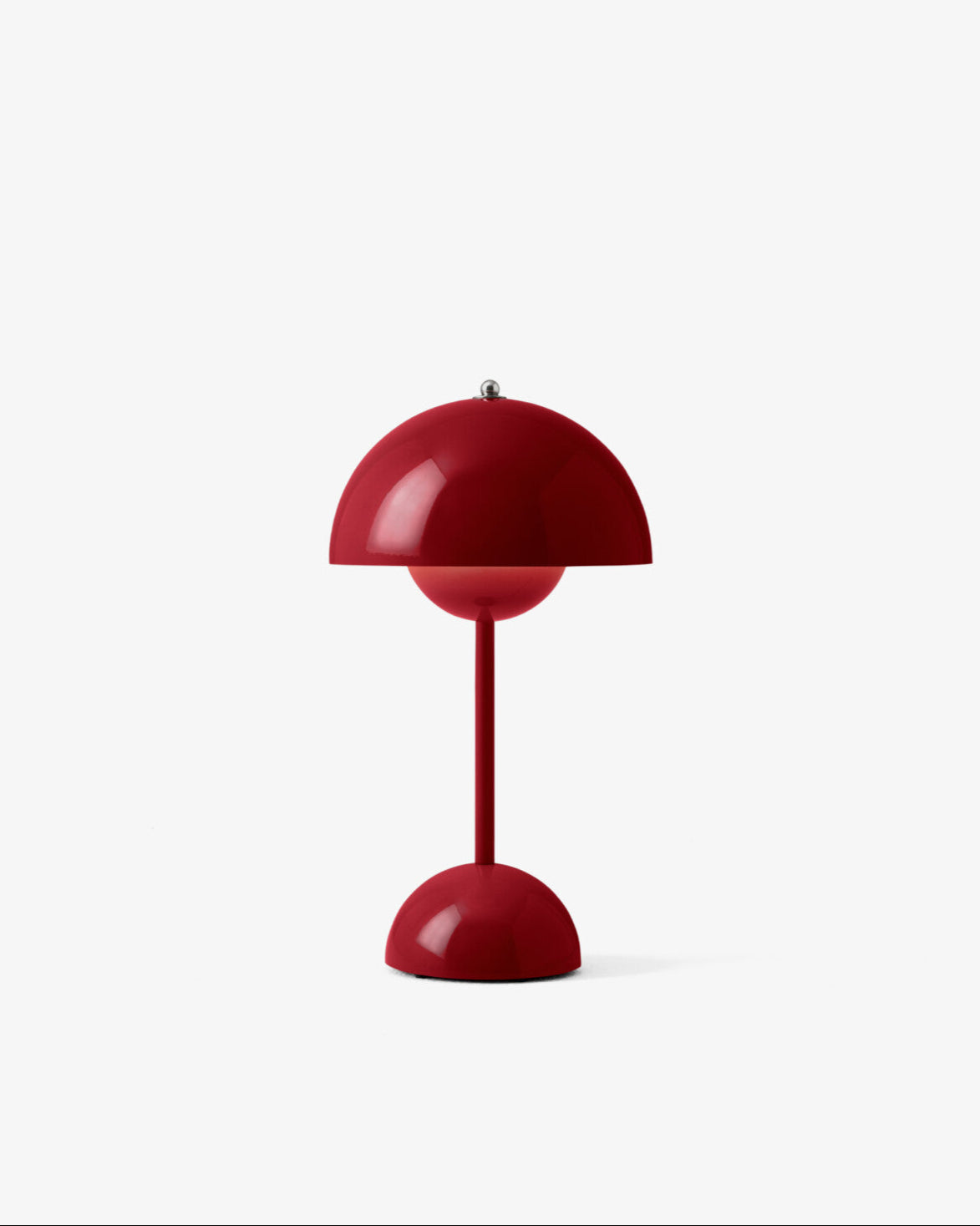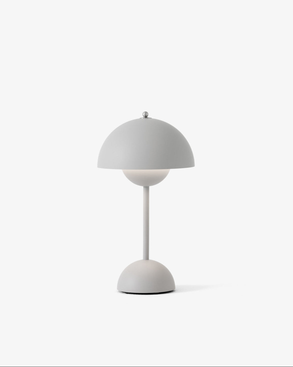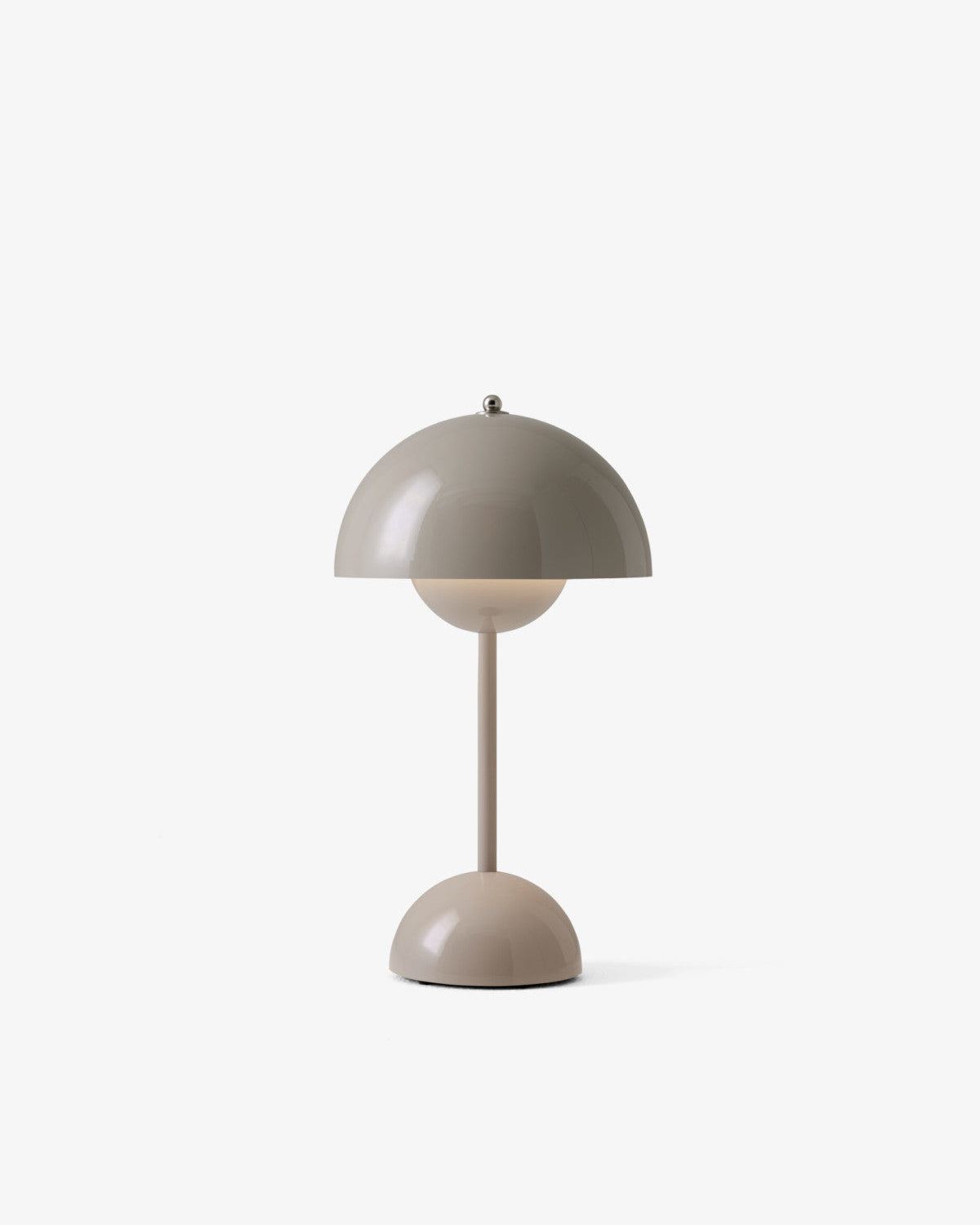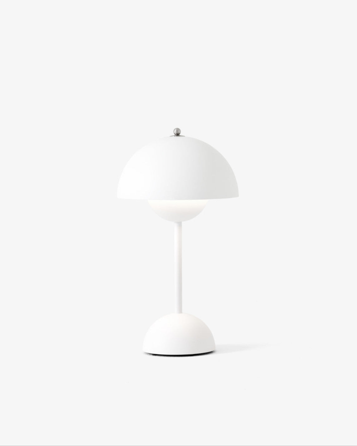 Med den samme ikoniske designen som Flowerpot-bordlampen har de små proporsjonene til VP9-lampen den ekstra fordelen at den er mobil. Den bevisst lette designen og den trådløse funksjonen gjør at lampen enkelt kan flyttes fra bord til disk etter behov.