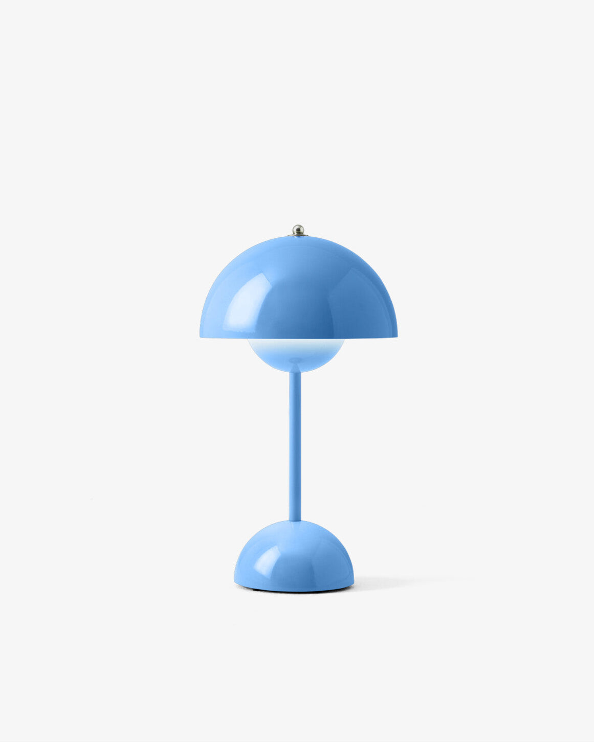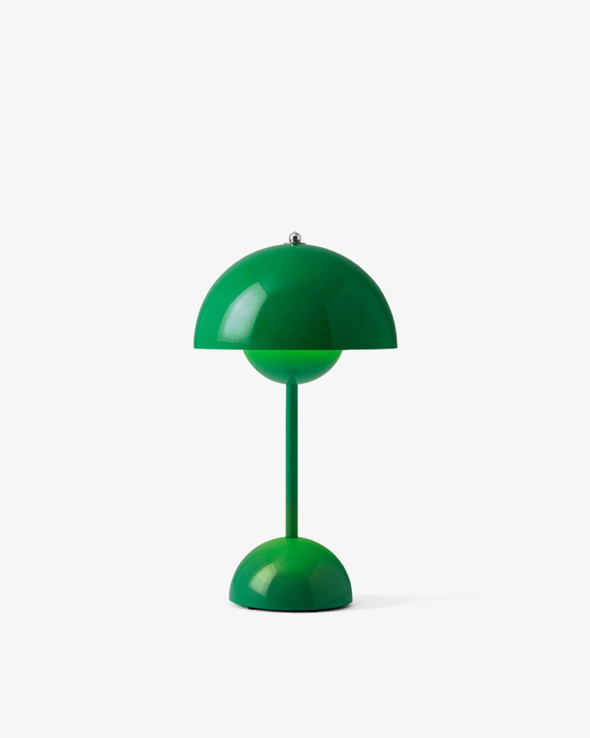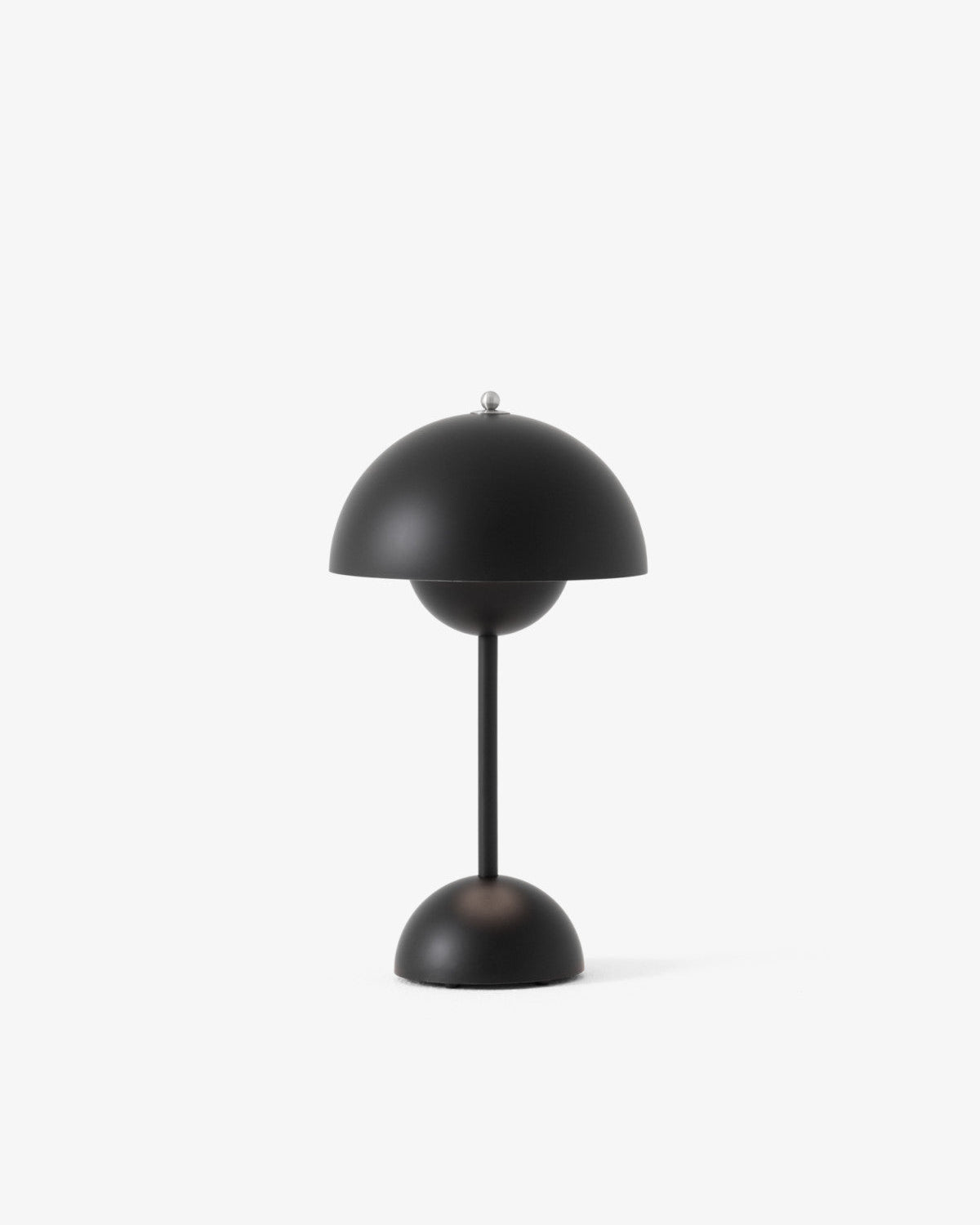 Med den samme ikoniske designen som Flowerpot-bordlampen har de små proporsjonene til VP9-lampen den ekstra fordelen at den er mobil. Den bevisst lette designen og den trådløse funksjonen gjør at lampen enkelt kan flyttes fra bord til disk etter behov.