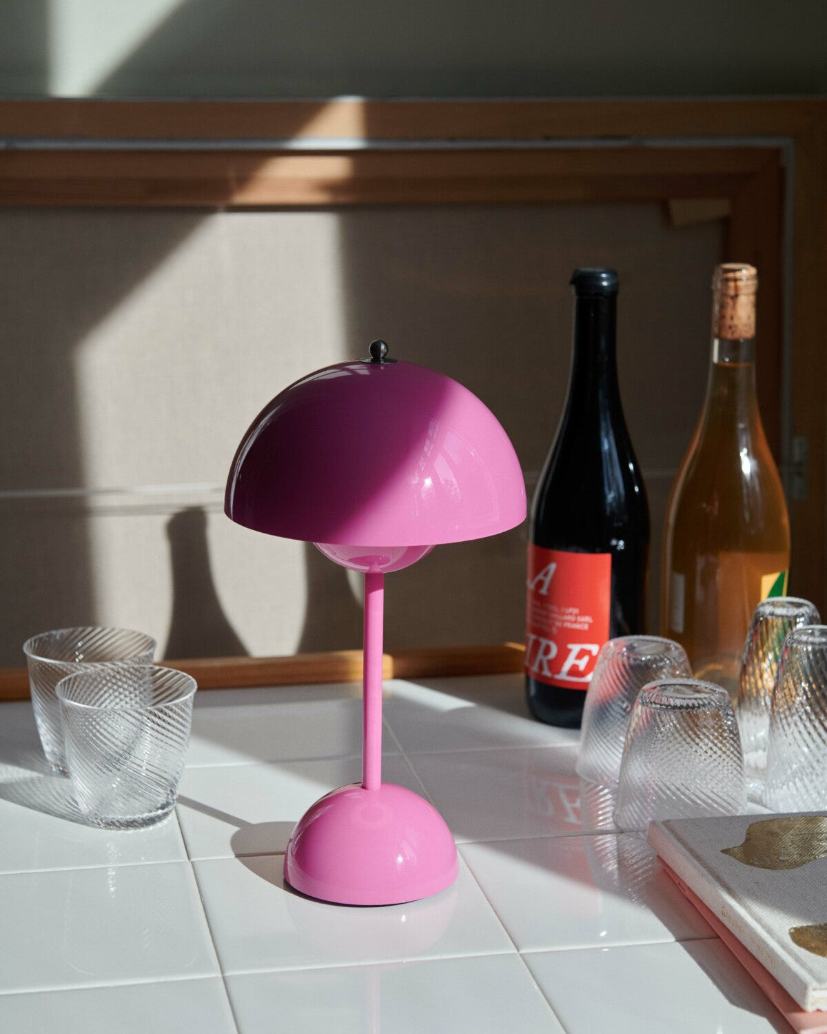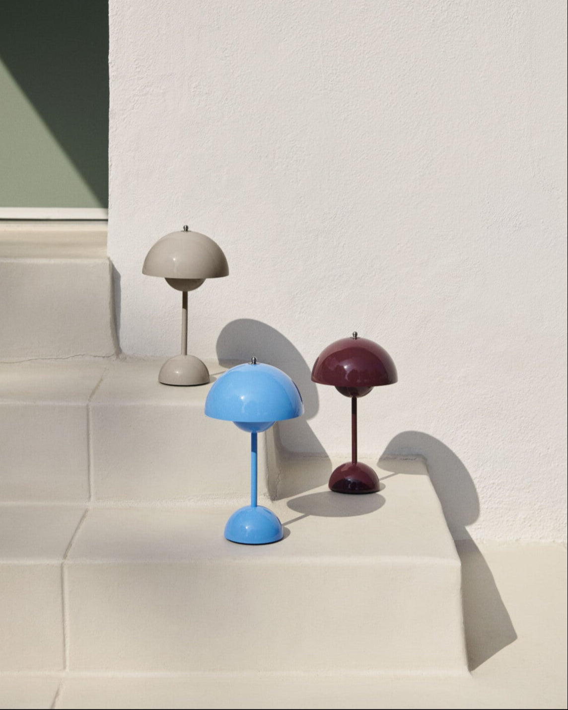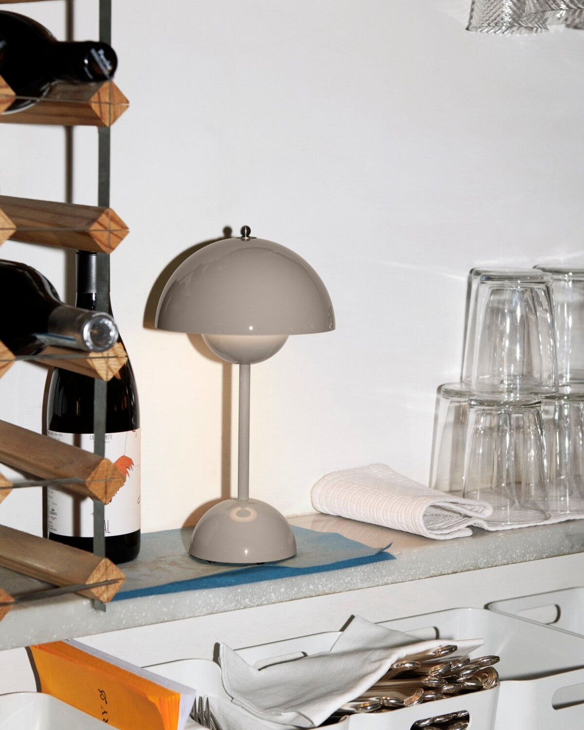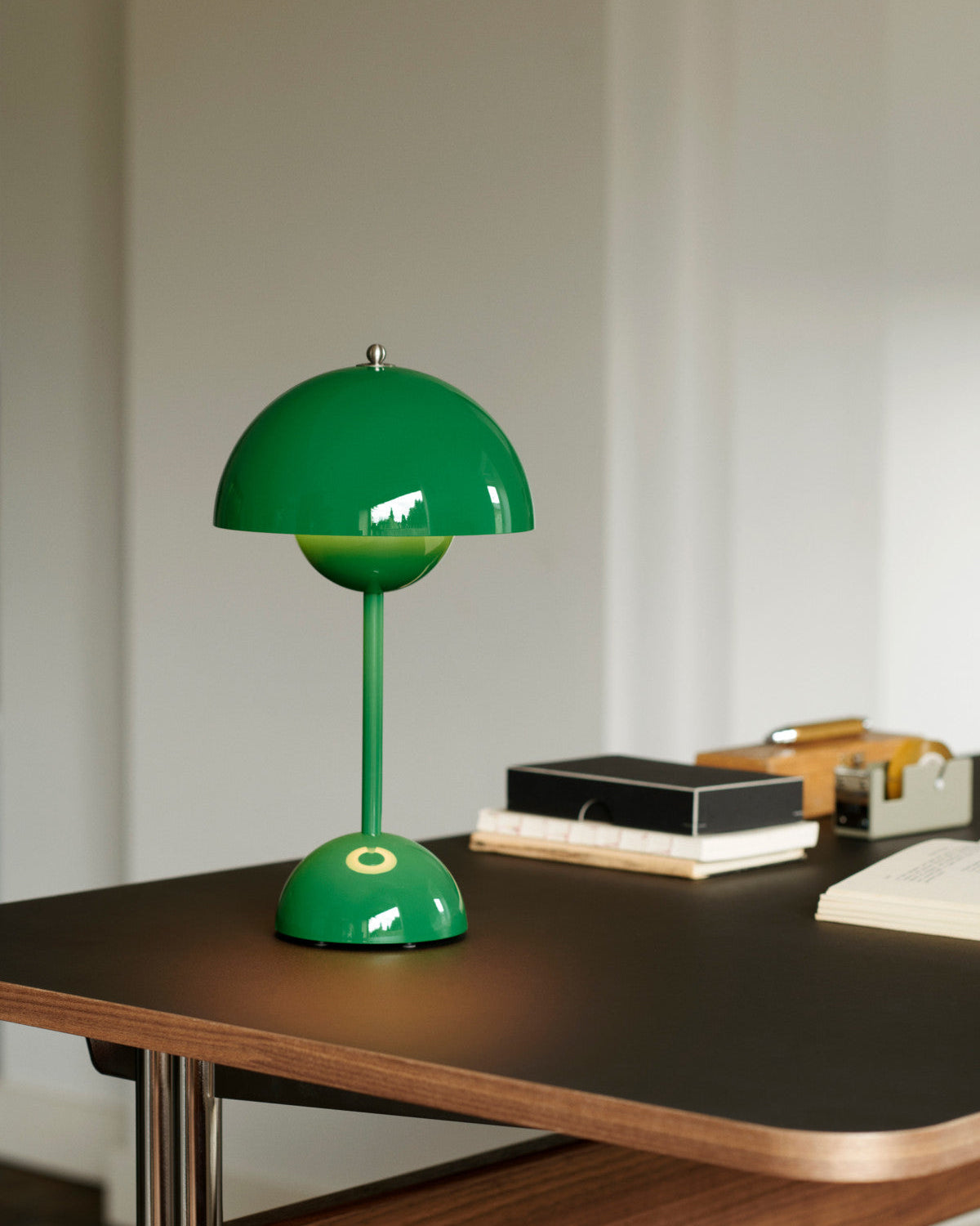 Med den samme ikoniske designen som Flowerpot-bordlampen har de små proporsjonene til VP9-lampen den ekstra fordelen at den er mobil. Den bevisst lette designen og den trådløse funksjonen gjør at lampen enkelt kan flyttes fra bord til disk etter behov.
