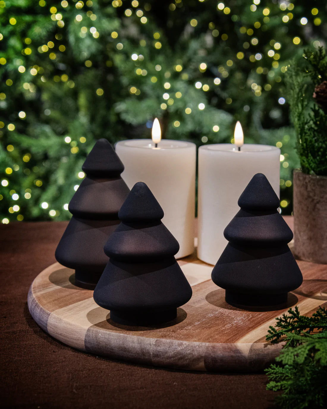 Den varme bruntonen gir et jordnært og koselig preg, mens den frostede overflaten skaper et dempet og stemningsfullt lysspill med LED-stearinlys. Perfekt som liten borddekorasjon alene eller i kombinasjon med de større grantrærne.