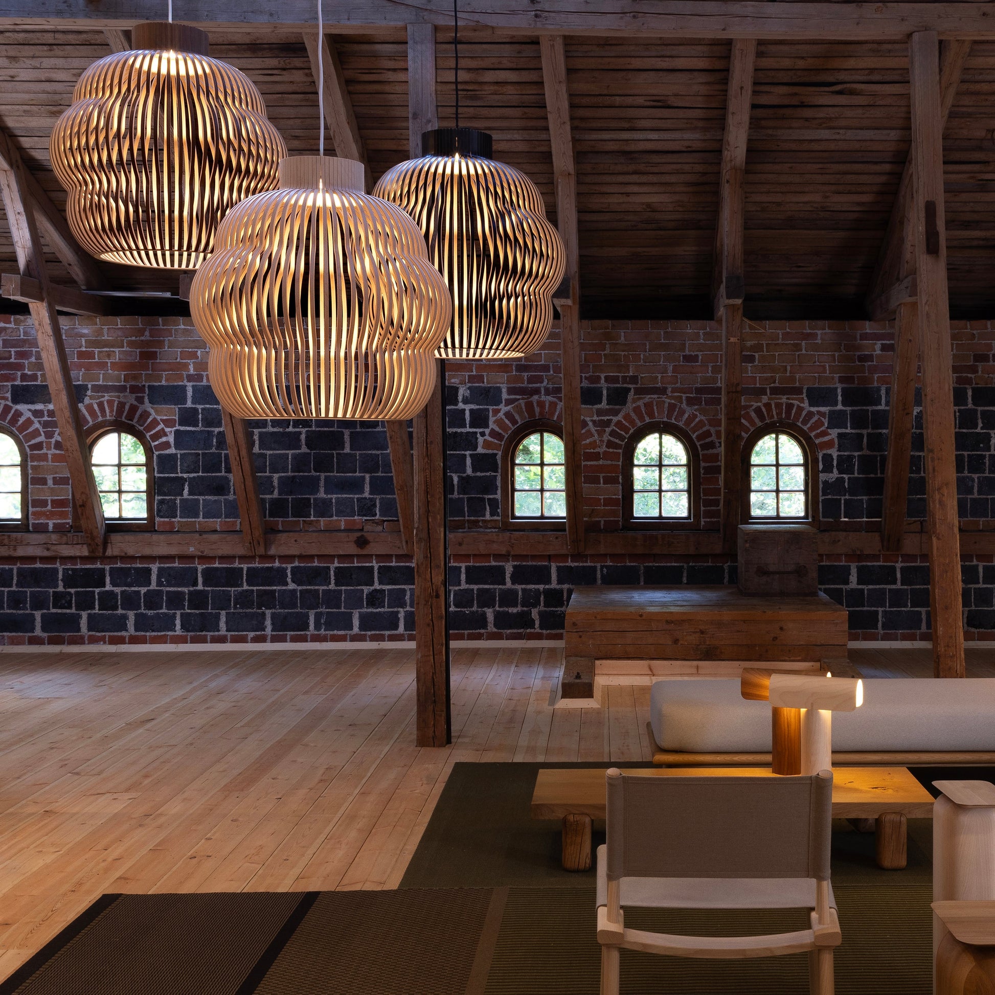 Kumulo 5200 taklampe er en vakker taklampe laget av form-pressede bjørkelameller. Lampen er kjent for sin høye kvalitet og unike design, og er håndlaget i Finland. Lampen har en høyde på 54 cm og en diameter på 55 cm, og kommer i fire farger; bjørk, hvit, sort og valnøtt. Lampen kommer med en GX53 (max 12 W) Led pære som kan dimmes, og har en ledning på 150 cm i tekstil og en takkopp. Lampen er til innendørsbruk, og veier 2,4 kg.
