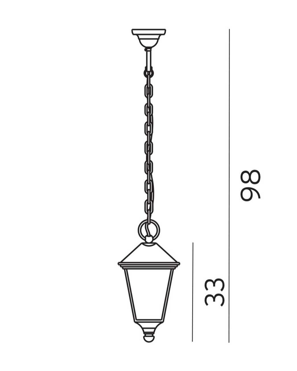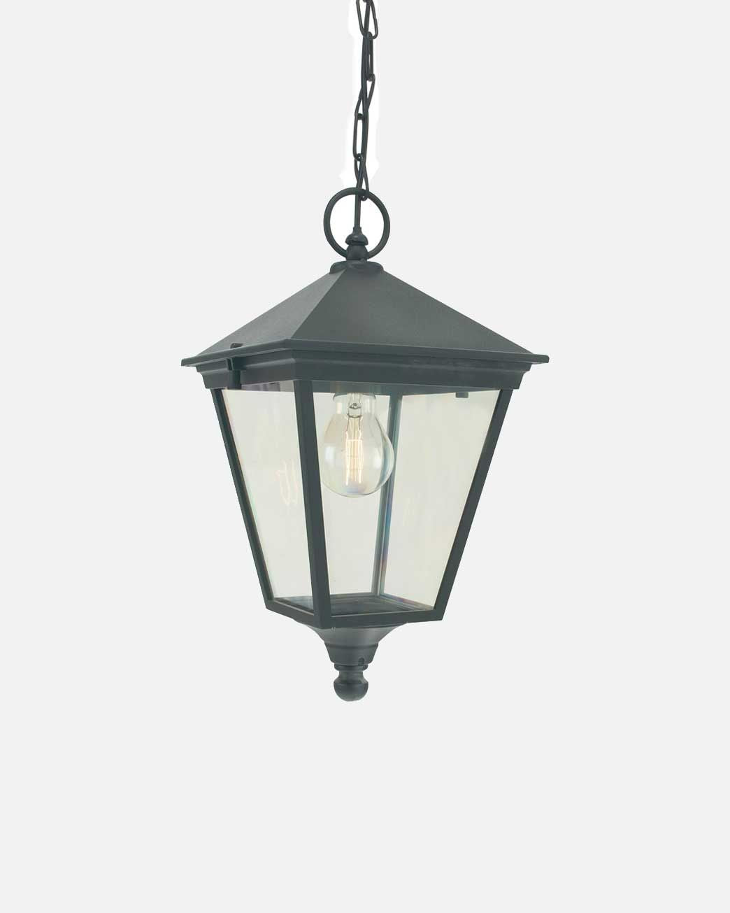 Taklampe i klassisk design. Glass i polykarbonat. London leveres i fargene sort. Lampen er en del av en serie som inneholder vegglamper som vender opp og ned, lampe i kjetting, portstolpe, blomsterstolpe og teleskopstolper med 1 til 3 lyktehoder.