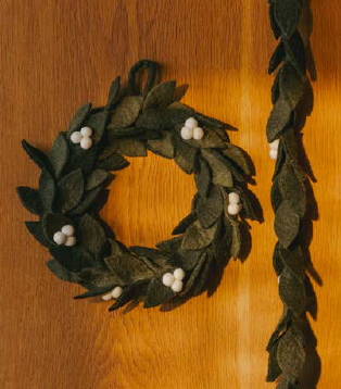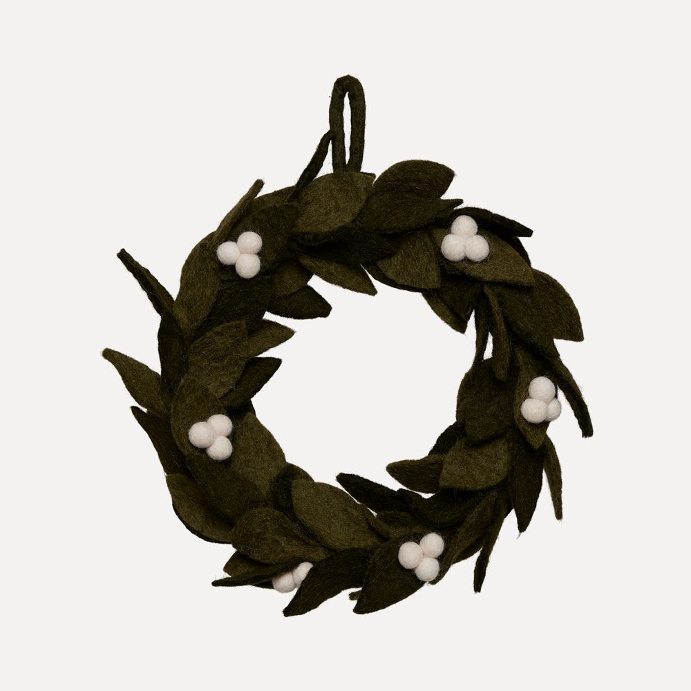 Ullkrans fra UND ø22 i fargen mørk mose med hvite bær.