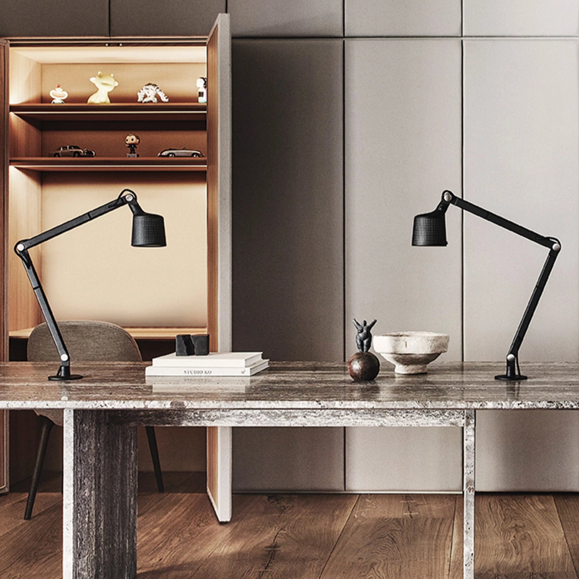 Vipp 521 insert skrivebordslampe er en arbeidslampe for kontoret eller hjemmet. Den er utstyrt med en justerbar arm, fingerskruer og en solid base for stabilitet. Lampen har en perforert skjerm og matt glass for en behagelig lysspredning.