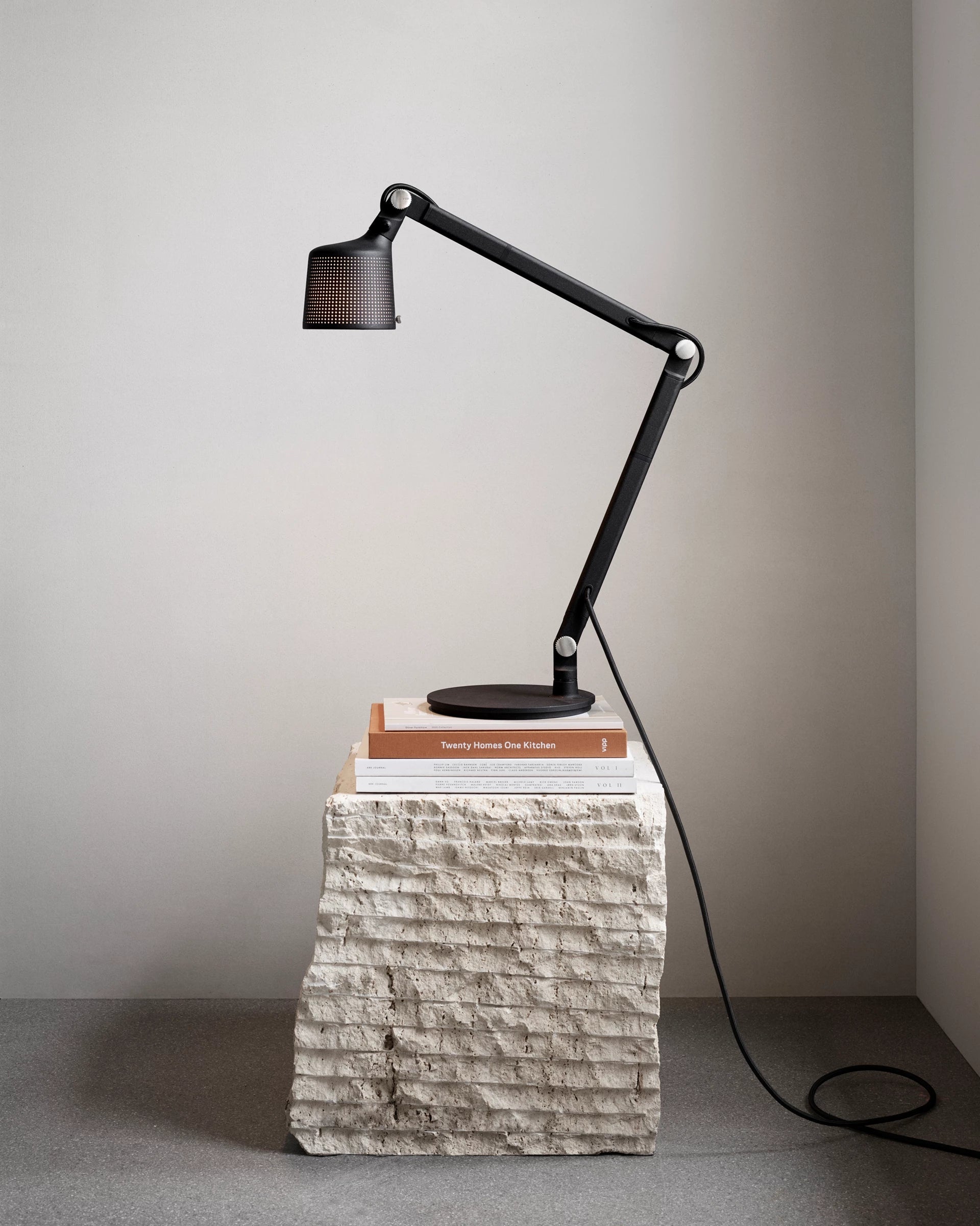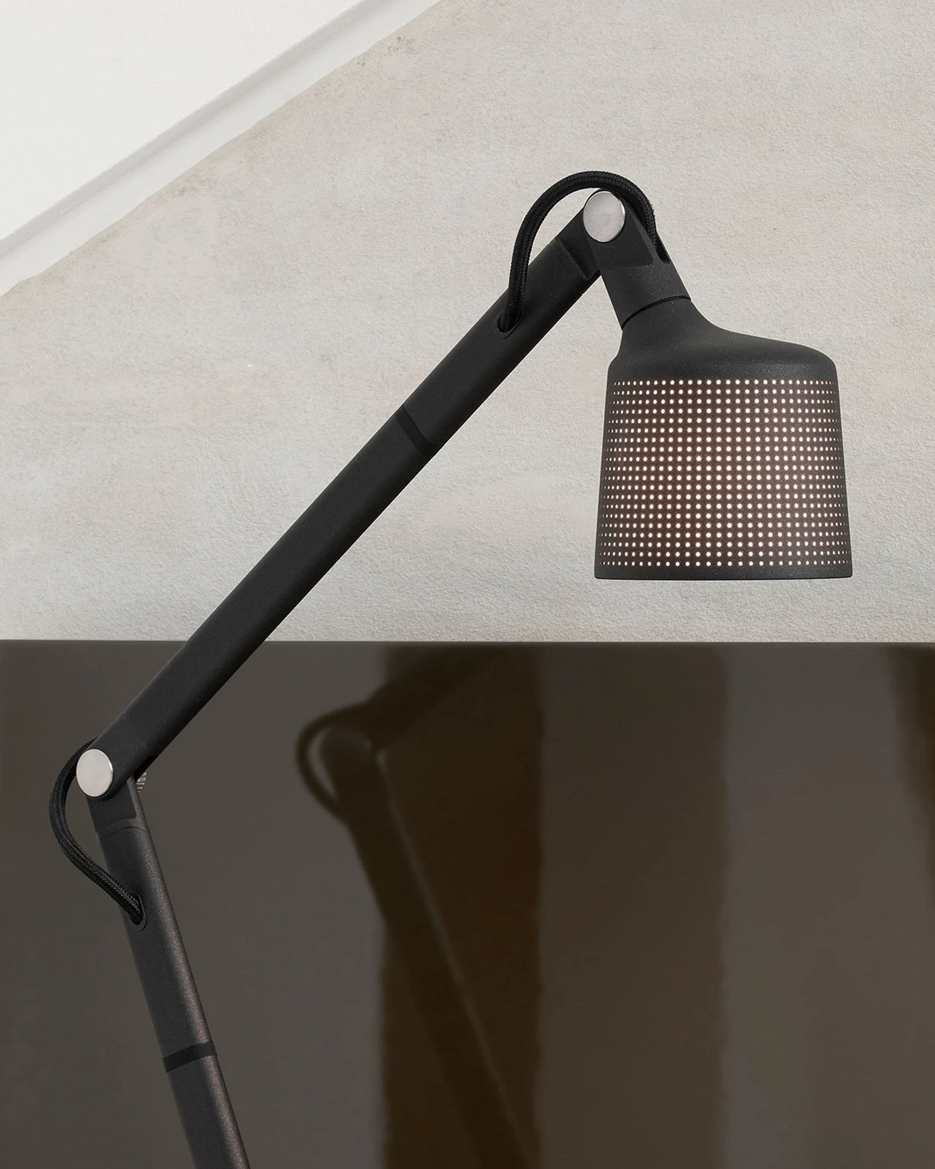 Vipp 521 skrivebordslampe er en arbeidslampe for kontoret eller hjemmet. Den er utstyrt med en justerbar arm, fingerskruer og en solid base for stabilitet. skrivebordslampen har en perforert skjerm og matt glass for en behagelig lysspredning.